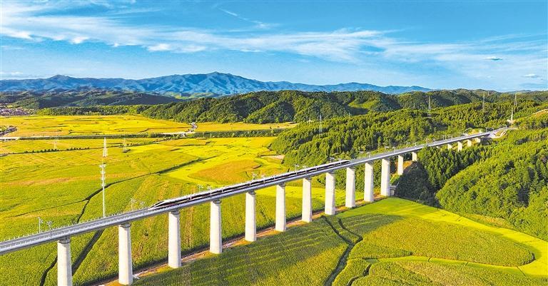 9月28日,一組復興號列車行駛在沈佳高鐵沈白段撫順市境內的線路上。當日,新建沈陽至長白山高速鐵路的首趟運行列車G8166次從長白山站出發行駛至撫順站,標志著沈佳高鐵沈白段正式投入運營。