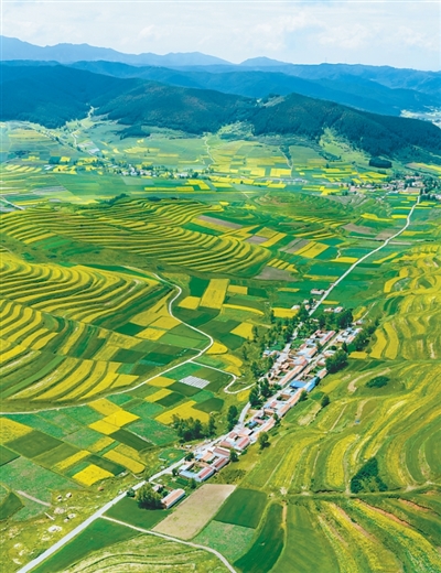 青海省西寧市大通回族土族自治縣,油菜花與麥田交錯(cuò)嵌套,成為一道亮麗的生態(tài)美景。