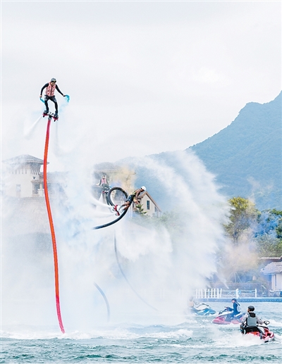 廣東省廣州市增城區(qū),依托廢棄礦湖、溫泉等資源打造的森林海旅游度假區(qū)內(nèi)正在進(jìn)行水上表演。