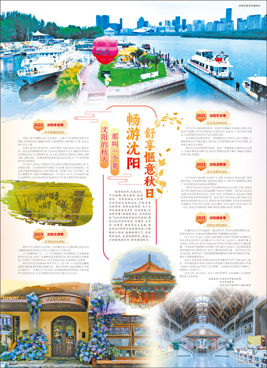 秋季的沈陽,天高云淡、萬木斑斕,煙火愜意、浪漫悠然。為更好滿足人民群眾對美好生活的向往,不斷豐富文旅供給、創(chuàng)新文旅場景,與廣大市民游客共慶豐年、共啟新篇,沈陽將開展“秋韻情意濃 沈陽別樣紅”2025沈陽秋季游系列活動,圍繞2025沈陽豐收季、文博季、藝術(shù)季、消費(fèi)季、健身季五大主題,推出近400項(xiàng)農(nóng)文體旅商活動,以暖暖的人情味、融融的煙火氣、濃濃的時尚風(fēng)、美美的國際范,誠邀八方游客暢游沈陽,舒享愜意秋日。