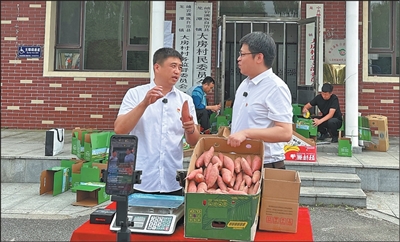 用手搓凈紅薯上的泥土,對著鏡頭講述賣點、特色,在遼寧省岫巖滿族自治縣龍潭鎮大房村村委會院里,張堡村第一書記劉生根和梨酒村第一書記劉暢支起手機,開始了一場助農直播。
